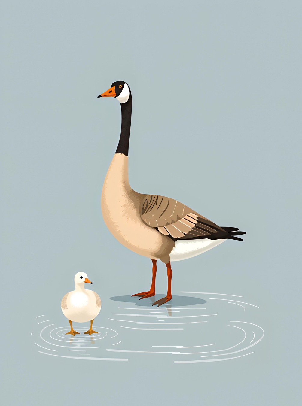 Bring serene beauty to your space with this downloadable wall art featuring a graceful Canadian goose and a charming white duck amidst gentle ripples on a soft blue background. Perfect for nature lovers and those seeking a calming ambiance in their home or office, this printable is ready to adorn your walls in the style of your choice.